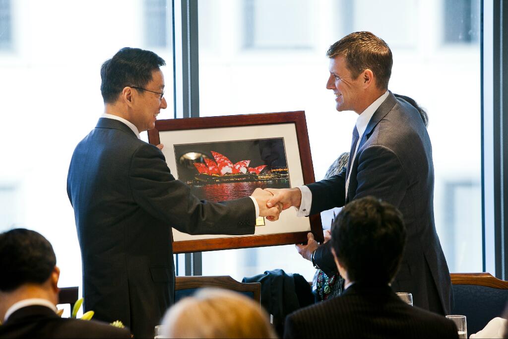 Mike Baird, former Premier of New South Wales, Australia, displays a Tubal-Cain Masonic handshake on 3rd June, 2014 with Han Zheng, representative of the Communist Party of China, and presents him with a picture of the Sydney Opera House in ‘Chinese red’.